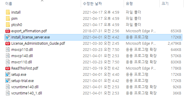 Creo 8.0.0.0 압축 파일을 풀면 이전 버전과는 달리 라이선스 서버와 Creo 설치 실행 파일이 분리되어 있습니다. 장단점이 있을 것 같은데 장점이라면 대부분의 고객은 서버를 설치할 필요가 없이 단지 서버 정보만 입력하면 되므로 설치 과정이 더 직관적이고, 단순해졌다고 볼 수 있겠습니다. 아래의 이미지와 같이 install_license_server.exe는 라이선스 서버만 설치를 담당하게 되고, setup.exe는 Creo 설치 및 라이선스 서버 지정만 가능하게 됩니다.
