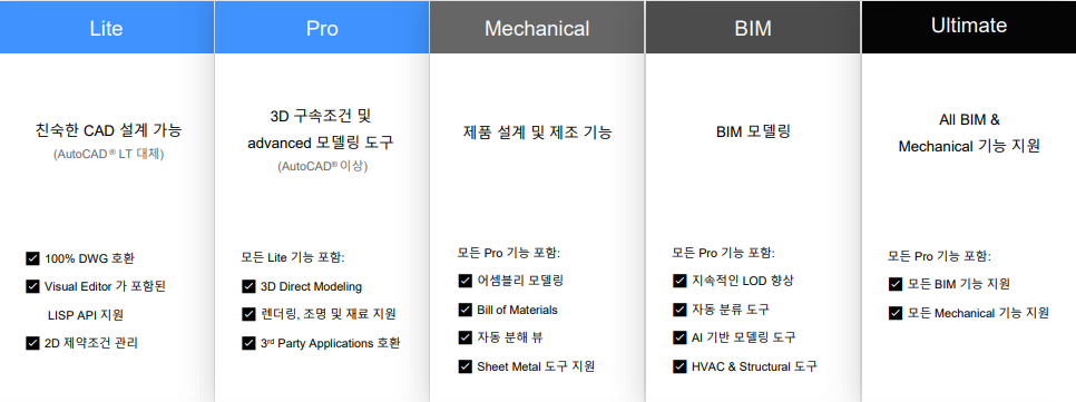 제품 구성은 위와 같이 Lite, Pro, Mechanical, BIM, Ultimate 로 나뉩니다.