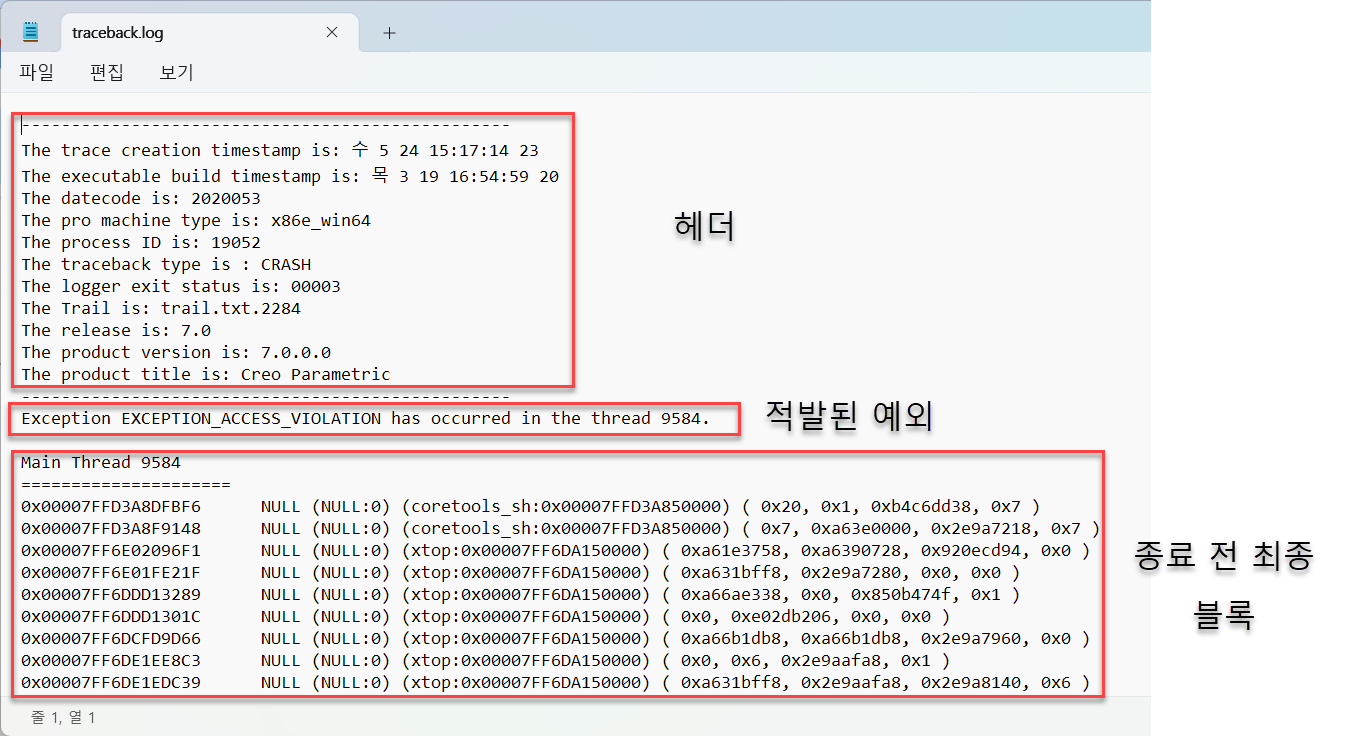 Creo가 종료할 때 생성되는 파일 중 std.out, std.err 그리고 traceback.log가 있습니다. std.out, std.err의 경우 파일을 메모장에서 열어보면 Creo crash 원인 유출이 가능하지만 traceback.log는 ASCII 로 구성되어 있음에도 그 원인을 알기가 매우 어려워서 보통은 PTC Technical Support 팀에 call을 발행해서 문의해야 합니다.