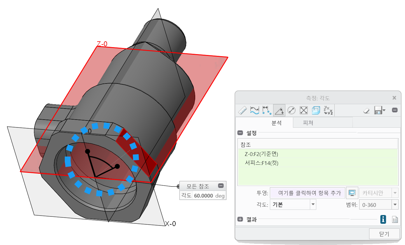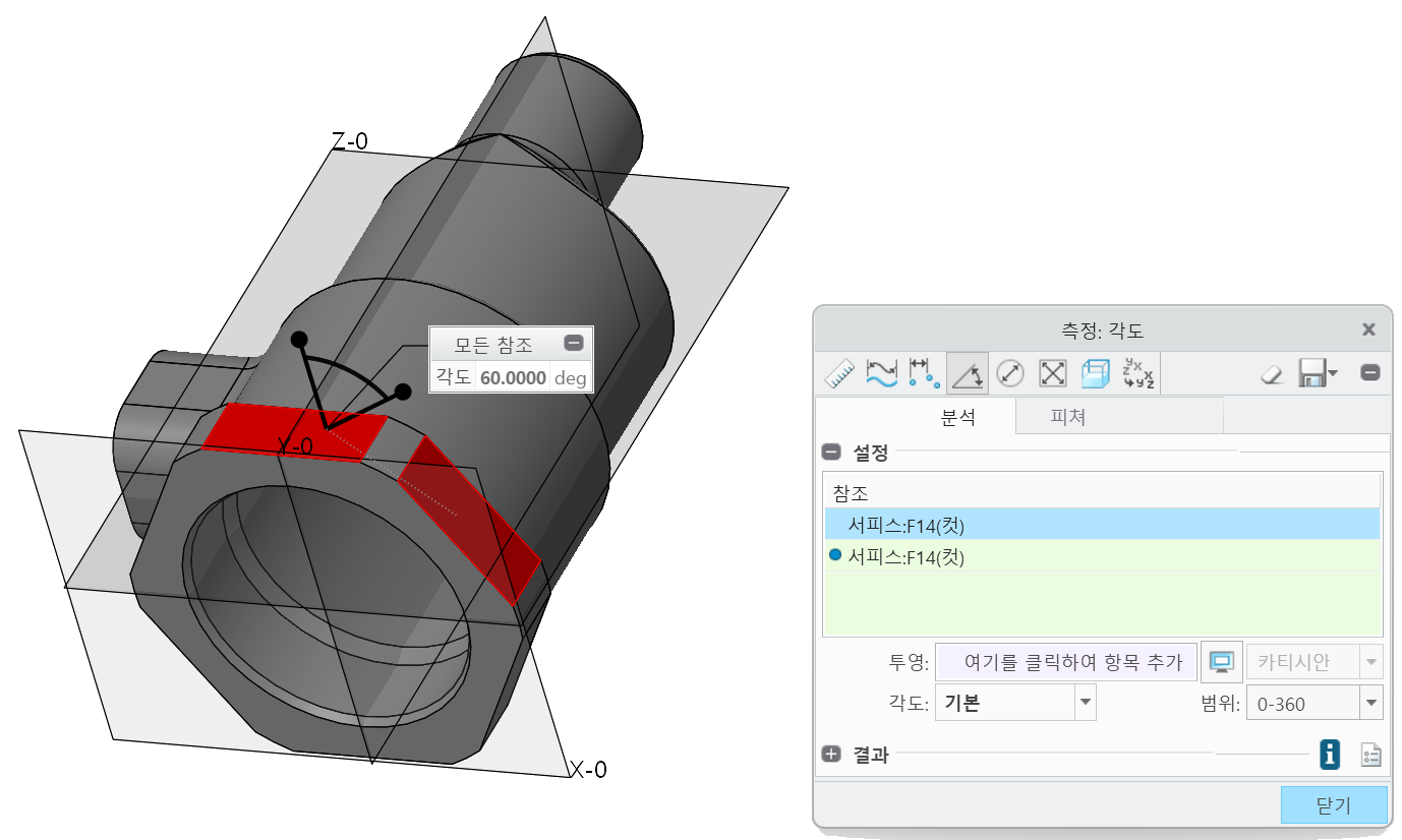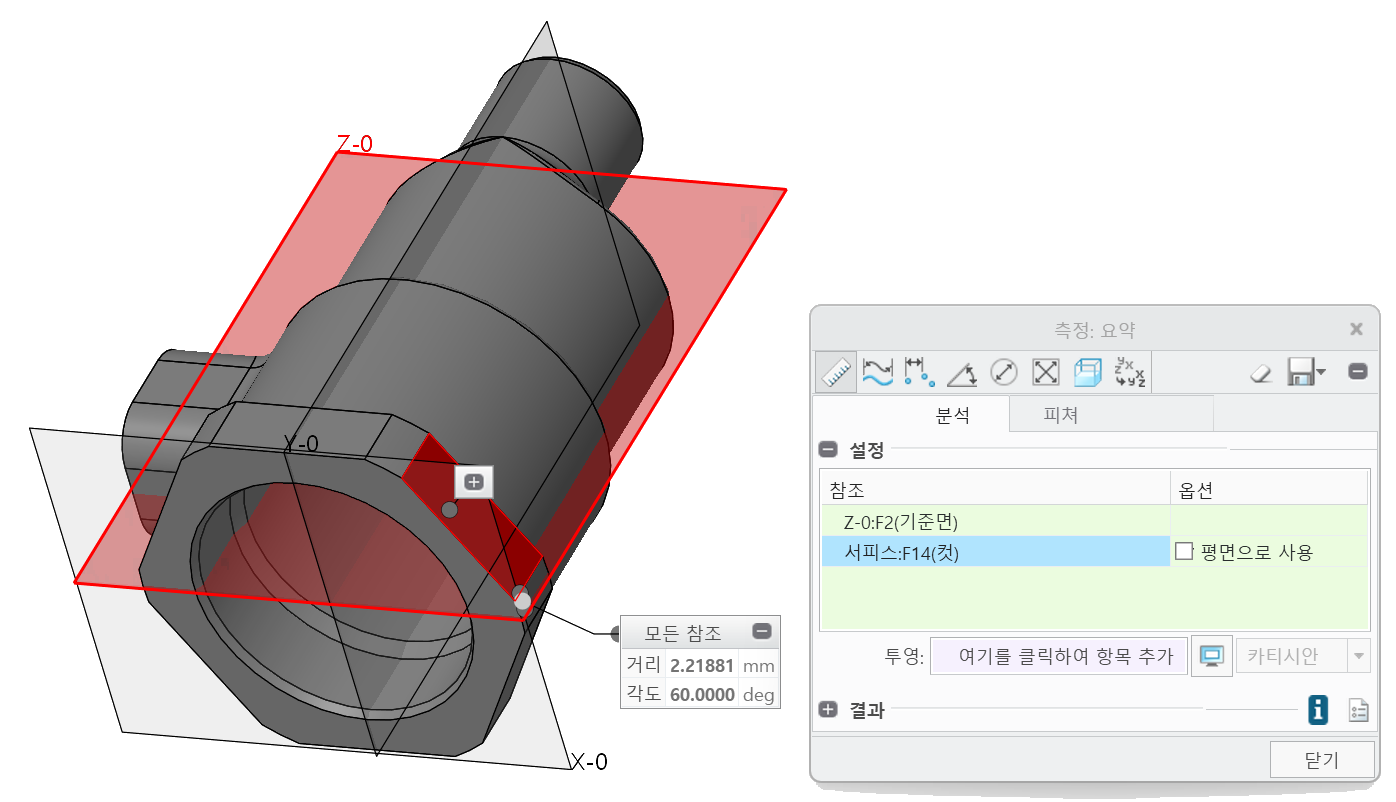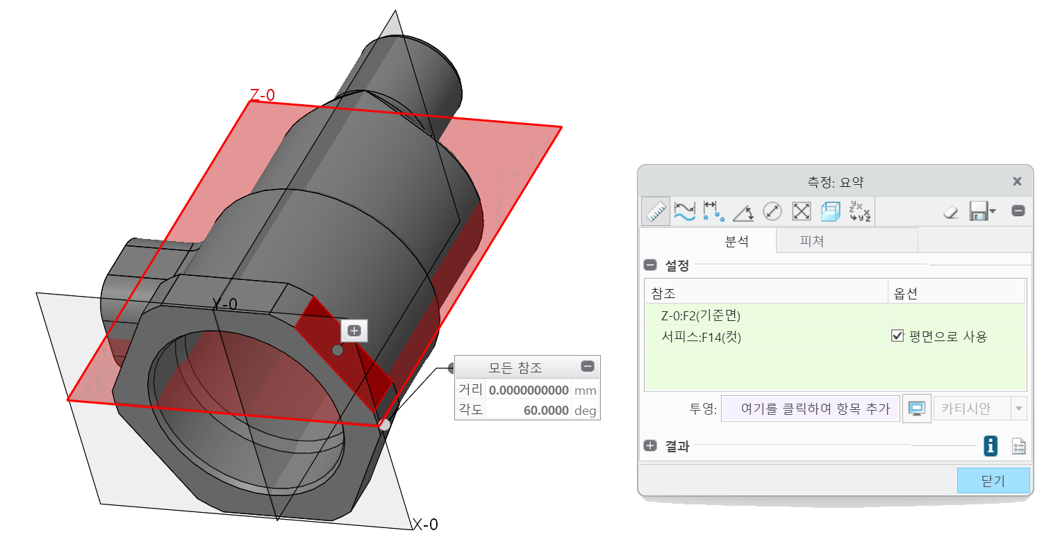위와 같이 각도와 거리가 표시됩니다. 각도의 방향은 표시되지 않으며, '옵션'의 '평면으로 사용'이 기본 체크되어 있으므로 거리는 0.0이 나옵니다. 이 옵션을 해제하면 선택한 평면과 기준면의 최단거리가 표시되게 됩니다.