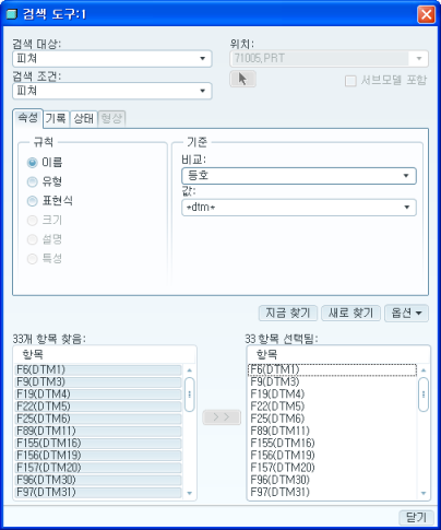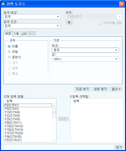 그러면 아래와 같은 창이 표시가 되는데 "검색 대상"과 "검색 조건"을 여러분이 원하는대로 선택을 하시면 됩니다. 저의 경우 피처의 이름을 검색할 것이기 때문에 아래와 같이 설정을 하였고, 피처 이름에 dtm 이 포함된 모든 피처를 검색할 것이기 때문에 값에 *DTM* 이라고 입력을 한 다음 "지금 찾기 "버튼을 눌렀습니다.