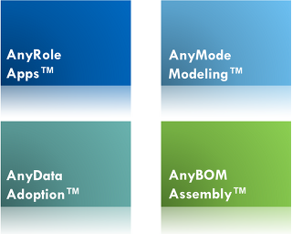 위와 4가지 요구에 대한 해결책을 마련하기 위해 Ceo에서는 AnyRole Apps.™, AnyMode Modeling™, AnyData Adoption™, AnyBOM Assembly™ 이라는 혁신적인 기술을 도입하여 고객에게 전달하게 되었다. Creo에 관심이 있으신 분들은 이미 이러한 용어를 들어보셨을 것이다.