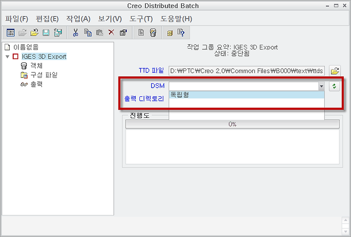 "확인"을 누르면 조금 전 지정을 한 "IGES 3D Export"라는 항목이 보입니다. 그 항목을 눌러보면 아래의 그림과 같은 정보가 보인는데 중요한 점은 "DSM"을 반드시 "독립형"으로 설정하셔야 한다는 것입니다.
