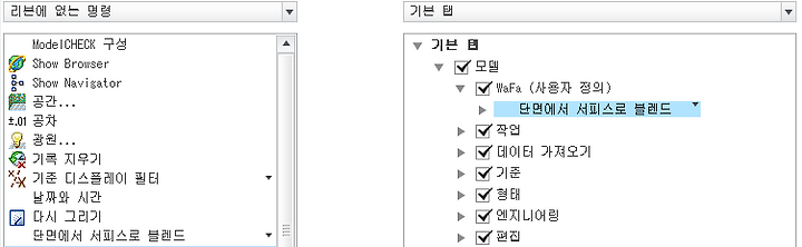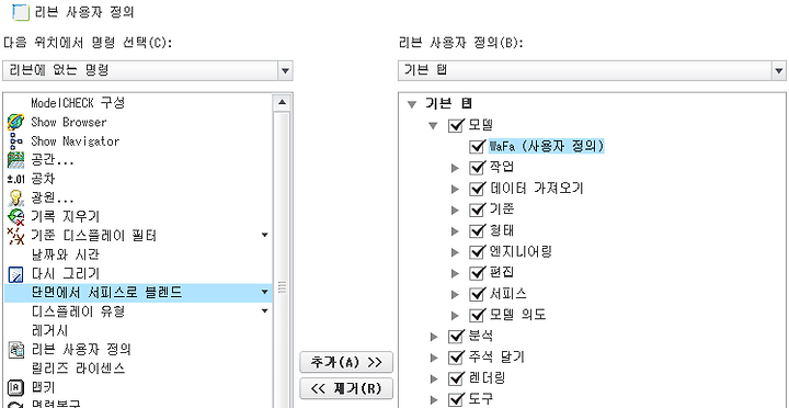 03. 좌측 탭의 목록을 "리본에 없는 명령"으로 지정하고, 우측 탭은 생성한 탭(WaFa) 이름을 선택 후 "추가(A) >>"를 누릅니다.
