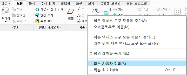 01. Creo 2.0을 실행하고, 새로운 부품을 시작 후, 리본바에서 RMB를 눌러 "리본 사용자 정의"를 선택합니다.