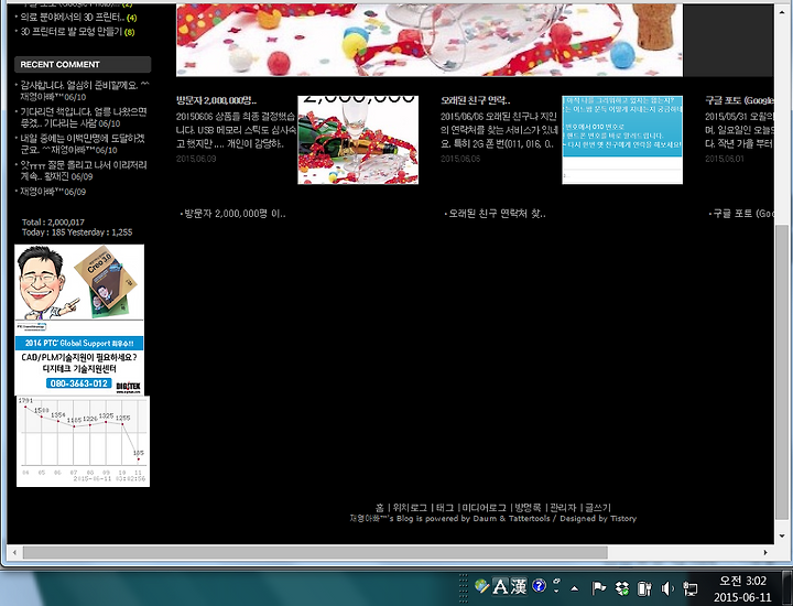 방문자 이백만(2,000,000)명 이벤트 공지를 하고, 딱 6개월이 지나서야 다시 업데이트를 드립니다. 사실 빠른 편이지만 처음 공지를 할 떄 머무 많은 분들이 접속을 해서 6개월이나 걸리 줄 몰랐습니다. ^^ 현재 접속하시는 분들이 하루 1000여명 되므로 1개월 내에 2,000,000 명에 도달 할 것으로 예상합니다. 예전 1,000,000명 이벤트(http://proe.tistory.com/446)를 할 때에는 한 분에게만 선물을 드렸지만 이번에는 가능한 많은 분들에게 선물을 드릴 수 있도록 해 최대한 노력을 해 보겠습니다. 이벤트 관련해서는 계속해서 업데이트를 할께요. ^^