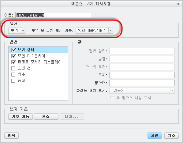이번에는 우측면도로 정의되어 있는 'VIEW_TEMPLATE_3'을 더블 클릭합니다. '유형'이 '투영'으로 되어 있고, 어떤 뷰를 기준으로 투영하는지를 의미하는 '투영 모 피처 보기 이름'이 'VIEW_TEMPLATE_1'로 설정되어 있습니다. 창을 닫습니다.