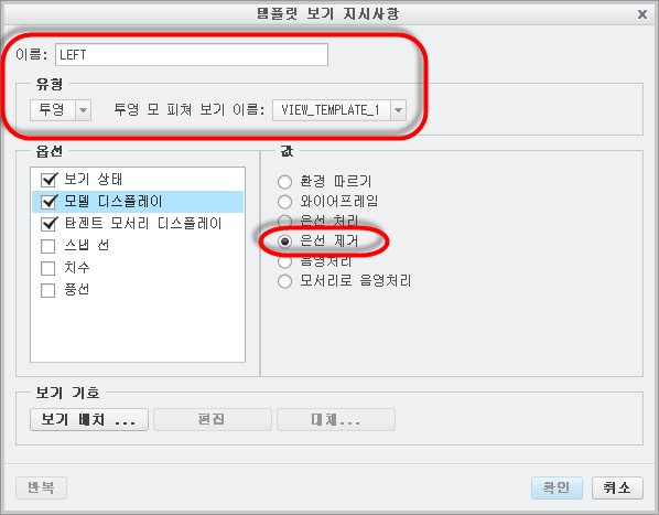 04. 이미 정의되어 있는 세 개의 뷰 이외에 이번에는 새로운 뷰를 정의해서 추가하겠습니다. '레이아웃' / '모델 보기' / '템플릿 보기'를 선택하고, '이름'을 기본 값에서 'LEFT'로 변경하고, '유형'을 '투영'으로 변경하고, '투영 모 피처 보기 이름'을 'VIEW_TEMPLATE_1'을 선택합니다. 그리고 은선은 표시안되도록 '모델 디스플레이'에서 '은선 제거'를 누르고, '보기 기호' / '보기 배치...'를 선택해서 'VIEW_TEMPLATE_1'의 왼쪽에 배치한다. 정확한 위치는 지정하지 않아도 된다.
