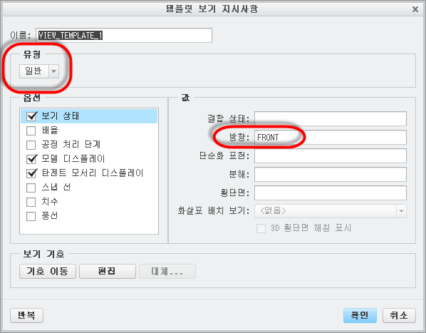 아래와 같이 '템플릿 보기 지시사항' 창이 표시되는데 뷰를 배치할 때 가장 중요한 것은 '유형'과 '방향'입니다. 'VIEW_TEMPLATE_1'은 처음 배치되는 뷰이기 때문에 뷰 '유형'이 '일반'이고, '방향'은 'FRONT'입니다. 중요한 것으 Pro/ENGINEER(프로엔지니어), Creo(크리오) 3D 모델에 반드시 'FRONT'라는 뷰 정보가 있어야 실제 도면에 뷰가 생성되고, 만일 그렇지 않을 경우에는 템플릿을 이용한다고 해도 뷰가 생성되지 않습니다. 물론 'FRONT'라는 이름은 3D 모델에서 정의되어 있는 다른 이름으로 정의/변경할 수 있습니다. '확인'을 눌러 창을 닫습니다.