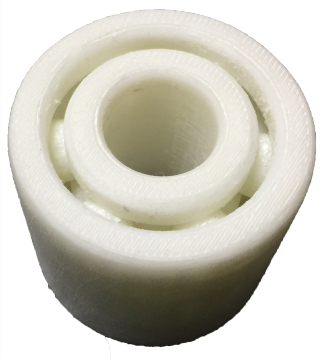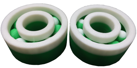 21. 다시 만든 베어링이며, 볼 갯수를 증가시켰습니다. 다음에는 실제 베어링에 있는 리테이너의 형상까지 같이 모델링을 해서 볼이 내/외륜의 축 방향으로 공전하지 못하도록 할 예정입니다. 흰색과 초록색을 섞어서 제품이 만들어졌지만 동시에 두 개의 필라멘트를 사용할 수는 없고,