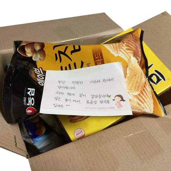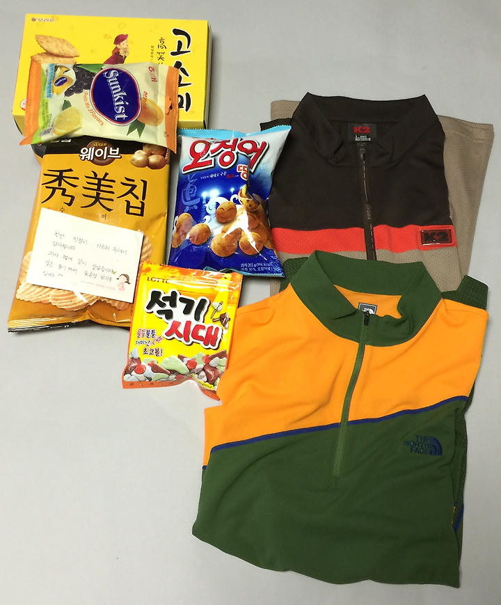 며칠 전 고객으로 부터 티 셔츠를 보내 줄테니 몸무게를 물어보시길래 간단히 답변드리고 잊고 있었는데 오늘 집에 도착을 해 보니 예상못한 선물이 와 있습니다. 정성이 충분히 느껴지는 자필 메모와 함께 두 장의 셔츠와 과자를 같이 보내주셨습니다. 잘 입고, 잘 먹겠습니다. 특히 막둥이가 너무 행복해 하네요. 감사합니다. ^^