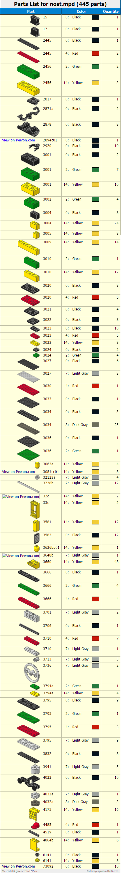 Tools / Part List를 선택하면 위 모델을 만들기 위해서 필요한 재료 종류와 갯수가 html로 생성됩니다. 위 모델에 대한 Part List를 추출했더니 무려 445개나 필요하다고 나오네요. 그리고 각 block의 고유 번호까지 표시되어 쉽게 구매할 수 있게 도와줍니다.