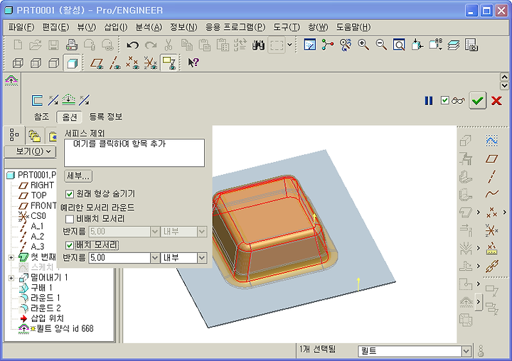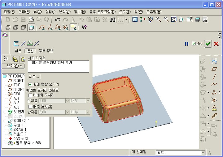 또한 옵션에서 원래 형상 숨기기가 체크 되어 있는 것을 확인을 하고, 배치 라운드에 적당한 값을 부여합니다.